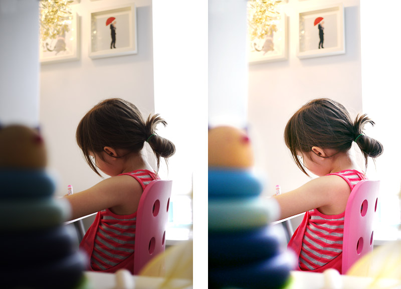The main image was a bit tricky, because of the extreme back light from the window. I didn’t want to use a fill flash, because it would’ve lit up the cubby shelf in front of her too much, so i had to meter to get just enough of the light tones captured, and manually brighten Mika and some foreground items in post (via correction curve). Then a slight color adjustment and that’s it. Here’s the before/after.